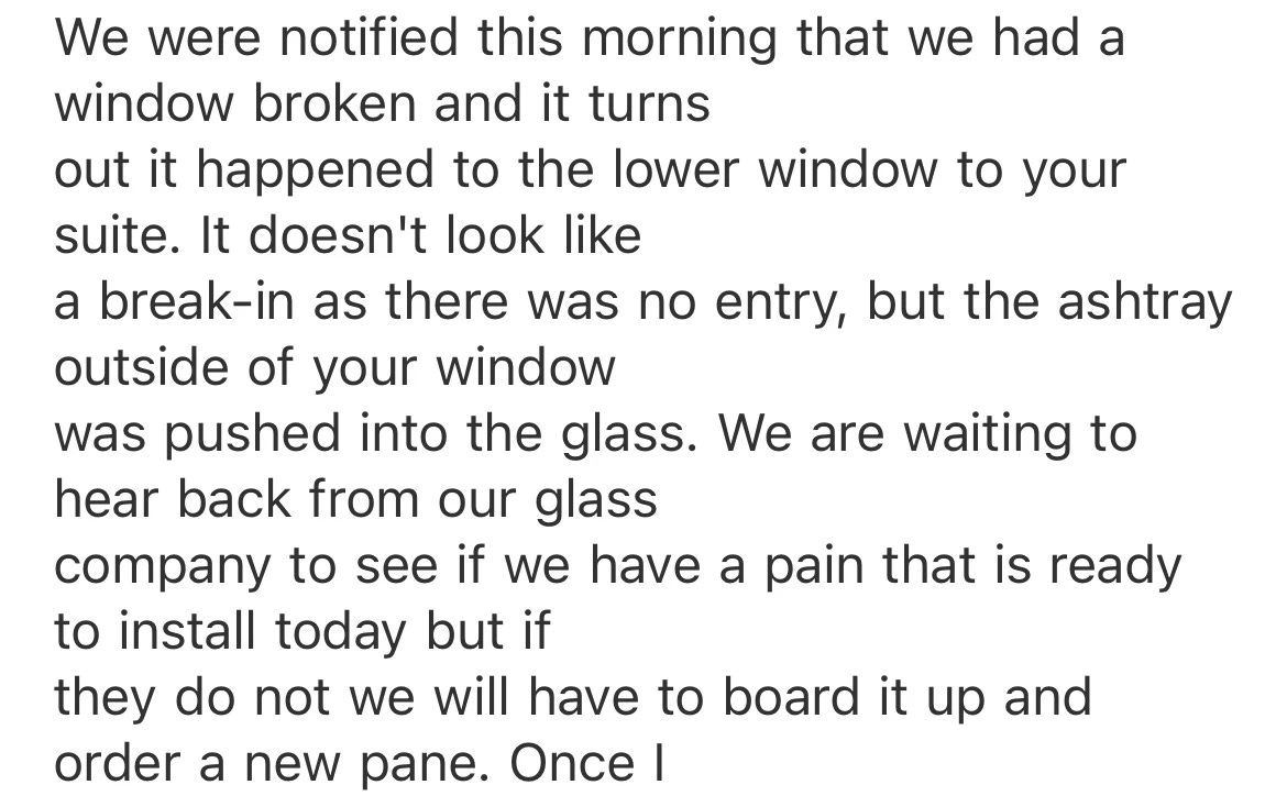 “We were notified this morning that we had a window broken and it turns out it happened to the lower window to your suite. It doesn't look like a break-in as there was no entry, but the ashtray outside of your window was pushed into the glass. We are waiting to hear back from our glass company to see if we have a pane that is ready to install today but if they do…”