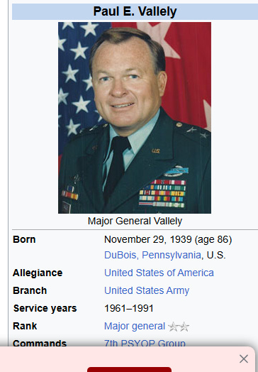 Paul E. Vallely is a retired U.S. Army Major General who served from 1961 to 1991. He commanded the 7th Psychological Operations Group and the 351st Civil Affairs Command, which included psychological warfare units. (Wikipedia)