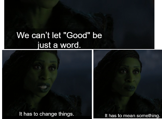 Glinda suggested she “should look into trademarking GOOD,” beginning a pattern emphasizing the word, which persists throughout the movie. It’s practically force-memed into the movie. Elphaba says they can’t let “Good” be reduced to just a word. She insists it has to mean something. Glinda is demonstrated to be living in a bubble throughout, lost in her selfishness, while Elphaba is focused on others. Whereas Glinda saw “Good” as a word to trademark and commodify, Elphaba saw it as an ideal to be achieved.
