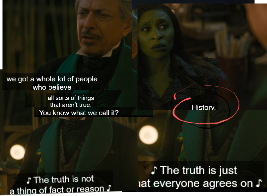 The Wizard explains that “the truth is not fact or reason” but “what everyone agrees on,” and that “we got a lot of people who believe all sorts of things that aren’t true.” He asks, “You know what we call it? History.”